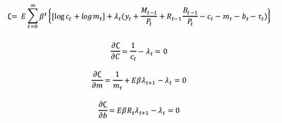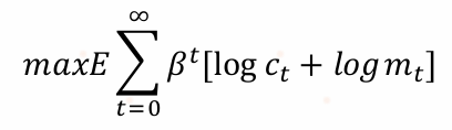 假设一个无限期生存的代表性消费者每期获得的收入为y,其中政府征用g来采购商品和服务,剩余的c全部用于消费。这是一个典型的无资本模型和MIU模型(Money-in-Utility),消费者的最大化效用函数为: