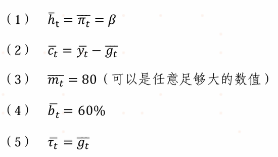 其中,我们将平衡状态下的产出y设为1,g为产出的20%,也即0.2,那么稳态时c就为0.8。同时,我们假设稳态时政府债务率为60%。