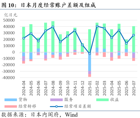 经常账户顺差扩大,但贸易转为逆差。7月日本国际收支经常账户差额+26843亿日元(前值+13482亿),其中货物贸易差额-1894亿日元(前值+4696亿),服务贸易差额为-6956亿日元(前值-1542亿),收益差额+15007亿日元(前值+40746亿),经常转移-5054亿日元(前值-4680亿)。