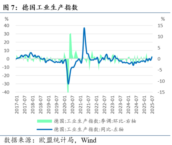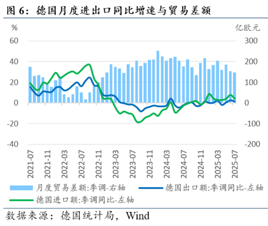 德国进出口增速下滑,对美出口大幅下降。德国7月出口季调同比+1.4%(前值+2.7%),进口季调同比+4.2%(前值+7.7%),贸易差额+147亿欧元(前值+154亿)。其中,对美出口环比下降7.9%,降至2021年来最低水平。