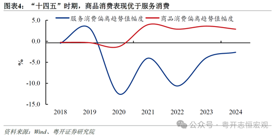 三是居民消费复苏呈现结构性差异,“十四五”期间商品消费表现较好,服务消费恢复相对滞后。在2020年居民消费受到了较大的外生冲击后,“十四五”期间的服务消费尚未恢复至2020年之前的趋势水平,恢复进度显著慢于商品消费。通过对2013-2019年的服务和商品消费值进行HP滤波处理得到趋势值,并基于这一趋势值线性外推得到2020-2024年的趋势值,可以清晰地观察到两者的差异。