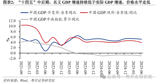 一是“十四五”中后期,价格水平持续走低,名义GDP增速持续低于实际GDP增速。“十四五”前期,宏观经济受到疫情冲击,2021年以后房地产市场深度调整,导致内需增长压力大,总需求下行拖累价格水平走低。从2023年开始,我国CPI和PPI增速明显放缓,CPI增速在0附近徘徊、PPI增速持续为负。截至2025年二季度末,名义GDP当季同比增速已连续9个季度低于实际GDP增速;2024年以来,GDP平减指数增速持续维持在-1%附近。