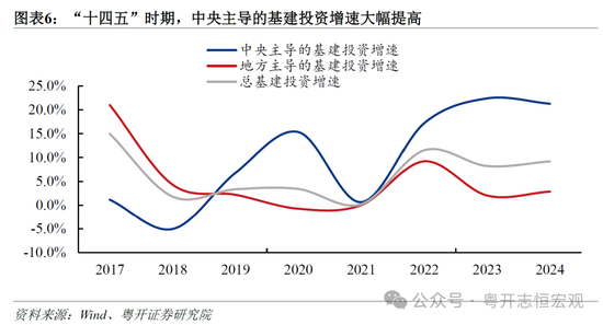 五是基建投资内部呈现明显分化,在地方政府隐性债务治理的背景下,中央政府主导的基建投资增速高于地方政府主导的基建投资增速。在基建行业中,电力热力燃气和水的生产供应业、铁路运输业和水利管理业的投资更多由中央政府或者中央企业主导,我们将这些行业的投资视为中央主导的基建投资;其他基建投资则视为主要由地方政府主导的投资。计算两类基建投资的增速可见:中央政府主导的基建投资增速在“十四五”之前不足10%,但“十四五”中后期,其增速迅速提高至20%以上;地方政府主导的基建投资增速则在2022年以后显著下滑,2023、2024年的增速只有2.0%和2.9%。