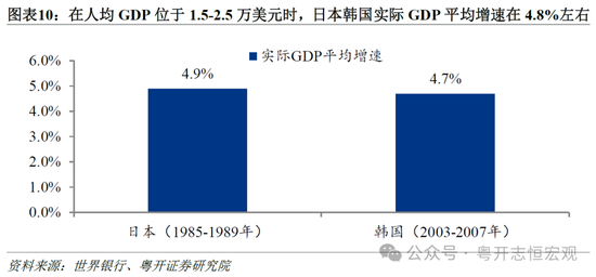 历史上日本、韩国等东亚赶超型经济体在相似发展阶段的实际GDP增速也在4.8%左右。日本在人均GDP从1.5万美元增长至2.5万美元期间(1985-1989年),实际GDP年均增速为4.9%;韩国在相似阶段(2003-2007年),实际GDP年均增速为4.7%。