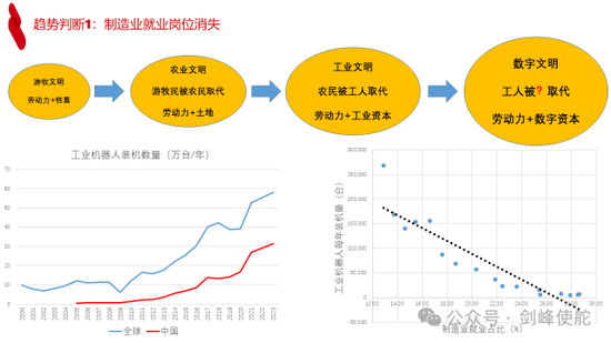 第一大趋势就是制造业就业岗位可能会消失。两张图分别给出了全球和中国每年工业机器人装机数量,中国每年装机量大概一半,右边那张图是中国工业机器人装机数量和私人部门制造业就业占比,就是一个负相关,即工业机器人装机数量越多,则制造业就业越少。过去几千年来,人类文明从游牧文明到农业文明,农业文明是劳动力+土地,农民替代了游牧民。1760年第一次工业革命之后进入工业文明,生产方式是劳动力+工业资本,工人取代了农民。上个世纪初美国的农业部门就业大概是40%,今天只有2%。未来的数字文明时代是什么呢?劳动力+数字资本,工人会被取代,会被谁取代,我打一个问号。