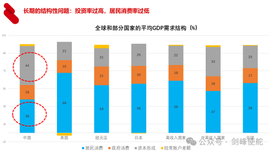 第二个参数就是投资率,投资/GDP,投资率越高的国家,投资回报率越低,实际上投资率越高本身就是说明投资效率比较低,这种投资率过高是长期的结构性的问题。从过去20年中国和其他国家平均水平来看,中国的投资率高达44%,比全国平均水平高出了将近20个百分点,同时家庭部门消费占GDP的比重只有38%,美国是68%,这种结构本身一方面从总需求端意味着内需长期不足,另外从供给侧会影响投资回报率。过高的投资率和过低的消费率是硬币的正反两面,所以,消费率过低实际上是从供求两端都会对经济产生影响。