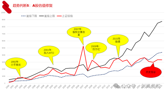 第五个判断是A股估值修复。A股跟美股有一个拇指规则,我们将道琼斯指数乘上10%构成了A股的下限,道琼斯指数乘上20%构成了A股的上限,1990年有A股以来就基本上是这个运转的态势,现在处于历史低谷。如果按照A股估值的拇指规则,现在A股应该是多少呢?4500。所以2015年《人民日报》网站曾经发过一个文章,说4000点才几步,我觉得这句话没错,只不过早说了十年。