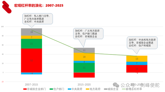 第三个阶段就是2020-2025年,由于房地产市场发生了调整,家庭部门去杠杆,同时城投公司也在去杠杆,加杠杆的主力主要是中央政府和地方政府,非城投企业也在加杠杆,这个阶段杠杆率上升了大概30多个百分点。