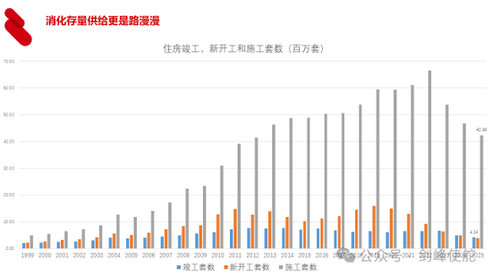 前面是新增的供求关系,从存量来看,我们可以看到这里给出了竣工套数、新开工套数和施工套数,2025年预计施工的套数在建的住房是4200万套,如果每年新增城镇家庭不到400万户的话,就意味着存量住房要用十年时间才能消耗完毕。