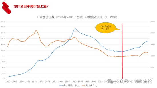 中国和日本都是人口负增长,日本人口负增长更靠前,我们看一下日本的情况,日本房价从1990年泡沫危机之后不断下跌,跌到2012年房价突然开始上涨了,2012年人口负增长,房价为什么会上涨呢?2012年发生了什么事情呢?