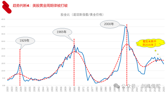 这就涉及到第四个趋势判断——美股黄金周期律被打破。观察1920年以来,过去100年以来,我们用美股除上黄金价格,可以发现美股的黄金周期有一个特点,就是每隔35年会达到一个顶点,1929年大萧条,1965年美国全面介入越南战争,然后2000年信息技术泡沫,未来会不会再出现一个美股的黄金周期的顶点呢?随着特朗普掀起的关税战,看起来熬不过2035年了,这意味着在终极安全资产黄金和风险资产美股之间,我们更看好黄金,相对看跌美股。