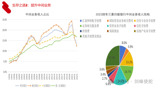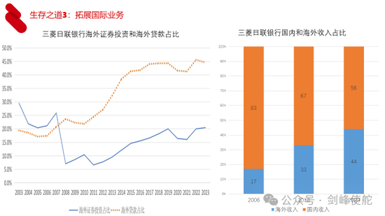 第三,拓展国际业务。我们以日本的三菱日联银行为例,海外贷款占比大幅度上升,海外收入占比也大幅度上升。