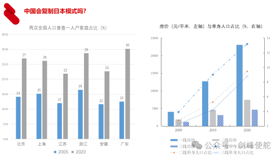 中国会复制日本模式吗?左边这个图给出了2005年和2020年两次全国人口普查的数据,就是单身人口一人户家庭占比,我们以上海为例,2005年全国人口普查的时候,单身家庭占全部家庭比重是15%,2020年是26%,上海很典型。然后这种单身人口家庭占比上升对房价产生什么影响呢?右边这个图我们给出了一线、二线、三线城市的房价以及单身人口占比,可以看到单身人口占比最高的一线城市房价涨得最快,从时间序列上来看也是,房价随着单身人口占比上升,这是我最近指导一个博士生在做的博士生论文,他做了很详细的统计,统计上显著证明单身人口上升对房价是有推动作用的。