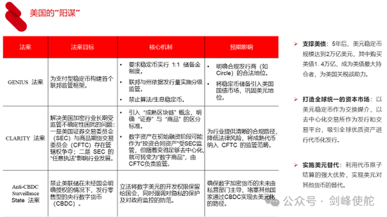 对于这种新的形态,我们可以看到今年美国通过了三个法案,一个叫《天才法案》《清晰法案》和《反CBDC法案》,为什么出台这三个法案呢?原因很简单,就是美国三个“阳谋”。第一,支撑美债,预计五年后美元稳定币的规模会达到2万亿,持有的美债达到1.4万亿,成为持有美债最大的机构,超过日本,支撑美债。第二,打造全球统一的资本市场,利用代币的可编程、可组合和原子结算的特性打造全球统一的资本市场。第三,实施美元替代,不仅是美元替代其他国家的货币,而且是基于美元的数字资产替代其他国家传统的金融体系。