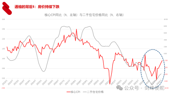 决定通胀率主要是两个因素,第一个因素就是房价,房地产构成了家庭部门最重要的资产,同时房地产上下游的链条特别长,房价如果持续下跌,意味着对物价水平是持续压缩的过程。这张图可以看到中国的二手住宅价格和核心CPI是高度同步。