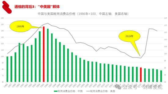 物价水平低的第三个原因就是外部环境。从1994年中国确立社会主义市场经济体制之后,中国全面加入了全球化。从1995年开始中国的耐用消费品价格(就是制造业产品)和美国的耐用消费品价格同时下降,原因很简单,中国生产、美国消费,形成了“中美国”的体制。从2018年特朗普上台之后,我们可以看到,随着特朗普推出一系列的脱钩措施,出现了另外一个现象就是中国的耐用消费品价格持续下跌,外部的需求冲击形成了通缩压力。同时,美国关税政策产生了供给冲击,使得通胀高企。简言之,就是中国生产出来的东西卖不掉,美国想消费没有东西。