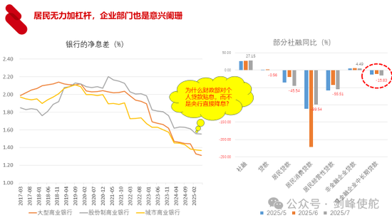 所以这种背景下,我们可以看到,从今年的数据来看,居民部门的消费贷款、经营贷款都大幅负增长,与此同时,企业部门的中长期贷款也是负增长,所以居民部门无力加杠杆,企业部门也是意兴阑珊。大家知道今年8月份财政部和人民银行联合出台了一个政策,就是对于个人消费贷款贴息。这个让大家觉得很奇怪,为什么贴息呢?你直接降息不就行了吗?为什么财政部还花钱贴息呢?原因很简单,因为银行部门的净息差不断地下降,到现在大型国有银行和城商行的净息差已经掉到了1.4%左右,股份制银行稍微好一点,大概是1.5%。一般认为净息差到1.5%,对银行的生存就是很大的挑战,在这种背景下,如果继续降息,银行的息差就会受到影响,所以采取了贴息的政策。