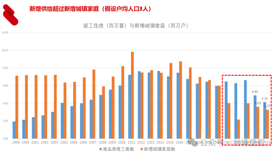 这张图比较了商品房每年竣工商品房的套数,形成了新增的供给,新增的需求来自于每年新增的城镇家庭。这里我们假定城镇家庭户均人口是三人,这是关键的假设,从2021年开始,新增的城镇家庭就持续低于竣工住房套数,就意味着房价不断下跌,比如说2025年住房竣工套数能达到400多万套,但是新增城镇家庭只有300万户,新增的供给超过了新增的需求。