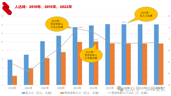 2015年还发生了一件事情,这件事情会对未来十年甚至更长时间产生重要影响,就是“人达峰”。中国人口达峰有三个峰值,第一个峰值是2010年,劳动年龄人口占总人口的比重达到峰值,第二个峰值就是2015年,劳动年龄人口达到峰值,从2016年开始,劳动年龄人口就负增长,第三个峰值就是2022年,总人口负增长。