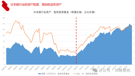 第三就是增加权益性资产,从2013年开始,日本银行业在股权投资基金的规模和比重不断上升。