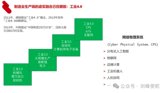 工业4.0最早是德国提出的概念,工业4.0的核心是网络物理系统,实际上通过分布式人工智能物联网边缘计算等等,实现制造业的智能化、无人化的生产。德国人提出工业4.0,但是真正实现工业4.0最快的是在中国,因为中国形成了庞大的基础设施就是工业互联网,在工业互联网时代,整个制造业有可能就是一个无人化、智能化的生产。