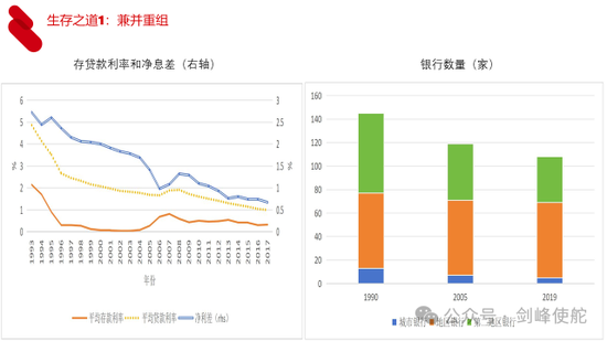 生存之道一,随着净息差的不断收窄,我们可以看到日本银行业在2013年之后净息差已经掉到1%以下了,养不活那么多银行业怎么办呢?兼并重组,我们可以看到日本三类银行的数量都大幅度下降。