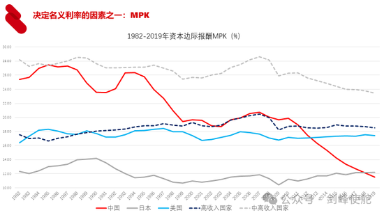 人口负增长产生什么样的影响呢?我们知道名义利率等于实际利率加上通胀率,一个经济体的实际利率是由资本边际报酬,通俗说就是投资回报率决定的。我们曾经对全球93个国家的资本边际报酬MPK做了统计分析,我们发现中国就是这条红色的线,中国的MPK从2010年第一个人达峰开始就持续下降,到2019年已经低于日本的水平,日本是一个长期低利率的国家。