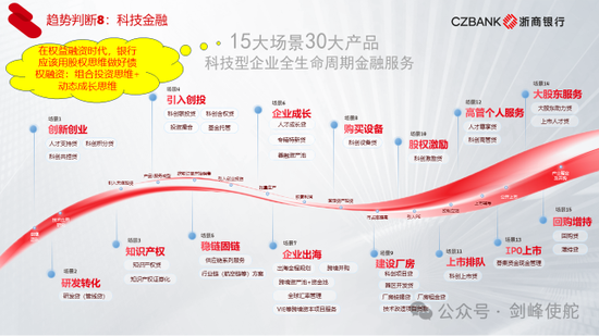 第八个趋势就是科技金融。以前认为银行不应该介入科创企业早期阶段,但事实上不是如此。我们以浙商银行为例,从企业组建团队一直到产业整合成熟的十五个场景中,都有相应的金融产品和服务。在权益融资时代,要用股权思维做好债权融资,股权思维是什么?就是组合投资思维和动态成长思维。