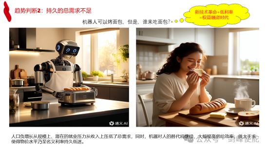 第二个趋势就是持久的总需求不足。在人口负增长时代,很多人说没有人了没关系,没有人烤面包可以机器人烤面包,但问题是机器人烤出来的面包谁来吃呢?所以可能是一个持久的总需求不足问题,这也意味着对利率形成一个持久的压力。当然在低利率时代,我们正在面临Web3.0、人工智能推动的新技术革命,所以,低利率加上技术革命就意味着这个时代是权益融资的时代。