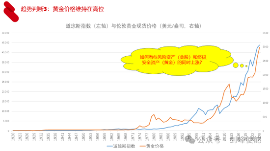 第三个判断是黄金价格可能维持在高位。原因很简单,因为美国掀起的关税战使得全球进入了不稳定的时期,美元霸权正在丧失,但尚没有其他国家货币可以取代美元,因此,黄金作为终极安全资产,其价格将维持在高位。但是黄金价格作为终极安全资产,同时美股作为一个风险资产。为什么两个都会上涨呢?