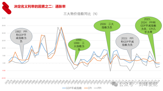 决定名义利率的第二个因素就是通胀率,这张图给出了1978年以来三个通胀指数,就是GDP平减指数、CPI、PPI。我们可以看到,2023、2024年,GDP平减指数是负的,PPI是负的,CPI几乎是0。最新的数据,8月份的CPI甚至也是负的,这三个物价指标都是负的,一方面意味着总需求不足,另外一方面意味着名义利率在比较低的水平。