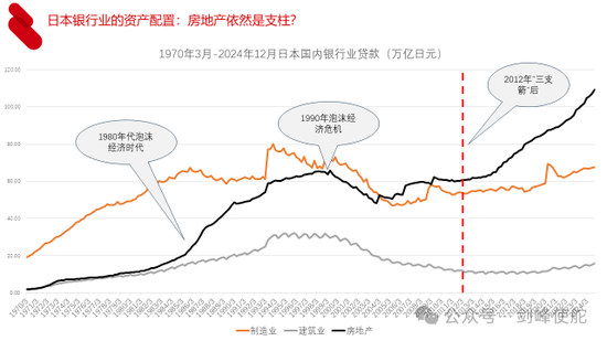 考察日本的银行业,首先看其资产配置。这张图给出了日本国内银行业在制造业、建筑业、房地产三个产业中的贷款,从1990年泡沫经济危机之后,房地产贷款就不断下降。但是从2012年安倍上台推出三支箭政策之后,日本银行业房地产贷款的总额已经占全部贷款的比重大幅上升。这里有一个问题,我们知道日本是最早经历人口负增长的国家,1991年劳动年龄人口占比达峰,1995年劳动年龄人口总数达峰,从1996年开始劳动年龄人口就负增长,2009年总人口达峰,2010年开始总人口负增长。一个人口负增长的国家,按理说房地产应该不好,为什么银行业会发放那么多房地产贷款呢?我们后面回答这个问题。