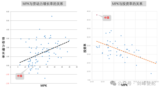 MPK是由什么决定呢?技术进步一定情况下,决定MPK就是两个关键的参数,第一个参数就是劳动力的增长率,就是劳动年龄人口的增长率,劳动年龄人口增速越慢的国家,投资回报率越低,中国左边这个图就是最左下角。