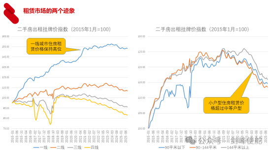 从租赁市场有两个迹象,左边这个图是二手房出租挂牌价指数,我们可以看到单身人口最高的一线城市,租赁价格一直保持在高位,右边这个图给出了不同户型的租赁价格,我们可以看到90平米以下的租赁价格是超过了90-144平米的租赁价格。