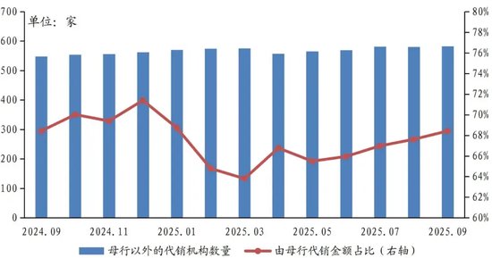 从当下的市场格局来看,母行渠道依然是银行理财子公司最大的依靠。今年一季度,整个理财行业由母行代销的金额占比降至65%以下,创历史新低。但在之后的半年里,这一数据又回升至接近70%。