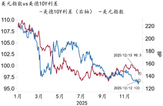 2025年,在全球贸易战与美国财政可持续风险发酵的先后催化下,去美元化一度成为全球金融市场交易的主导逻辑,叠加市场对美国降息交易的押注,美元在上半年明显走弱,下半年维持低位震荡走势,截至2025年12月15日,美元跌幅为9.4%。