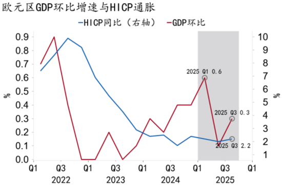 欧央行于6月结束本轮降息周期,2024年6月至2025年6月累计降息幅度达到200bp(图73),成为欧洲经济修复的核心驱动。2024年以来,欧洲同样实现“金发女郎经济”,经济扩张与通胀回落同步发生。2025年前三季度,欧元区经济增速中枢0.3%,HICP通胀中枢2.1%,节奏上受到关税冲击,二季度以来经济增速显著下行(图74)。