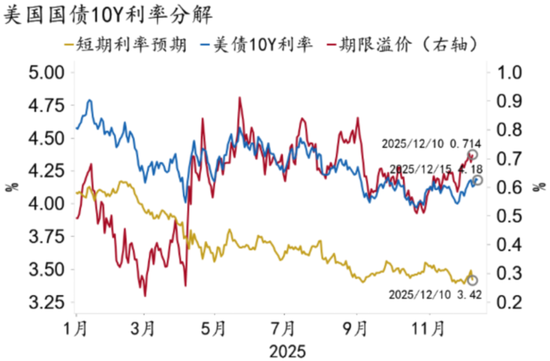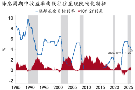 展望2026,10Y美债利率中枢预计将小幅回落,从2025年的4.3%降至4.0%左右,波动区间在3.3-4.5%之间。美债短端利率中枢将进一步下行,利率曲线也将延续陡峭化特征。