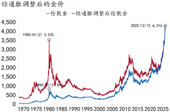 2025年,在关税担忧、去美元化叙事、美联储重启降息、地缘政治风险反复的影响下,黄金延续上涨形态且涨幅明显扩大,伦敦金从$2,600涨至$4,300,上海金从600元/克涨至1,000元/克,涨幅一度超过60%,这也是自1980年以来的最大年度涨幅。