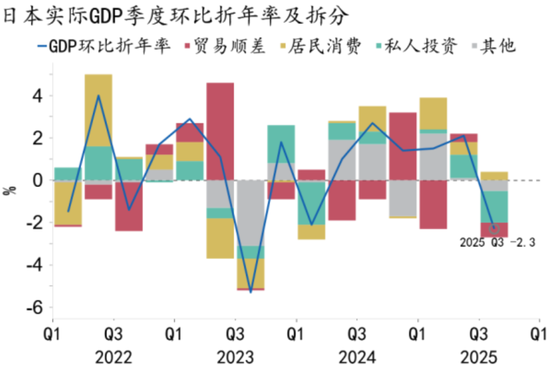 日本经济处于通胀修复红利的尾声阶段,美国关税可能成为日本经济再度陷入困境的导火索。始于2022年的通胀修复,打破了薪资与物价不会轻易上涨的社会共识,同时修复了国际社会对日本经济长期处于通缩状态的悲观预期。2025年前三季度,日本CPI通胀中枢达到3.1%,名义薪资增速中枢达到4.2%,趋势上高位企稳(图75),且居民实际收入保持正增长。然而,三季度日本经济在美国关税冲击下陡峭回落(图76),结构上表现为投资与出口“双杀”,标志着本轮经济修复已经行至尾声。