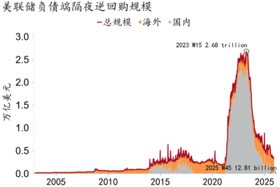 此外,美联储于12月停止缩表并重启技术性扩表,美元流动性压力边际缓和。一是准备金规模已经降至合意水平。根据多数学术研究,一般认为准备金占名义GDP的比例应当位于10-12%区间,目前这一比例位于11%附近(图61)。二是冗余流动性已经枯竭,国内隔夜逆回购规模跌至0附近(图62)。