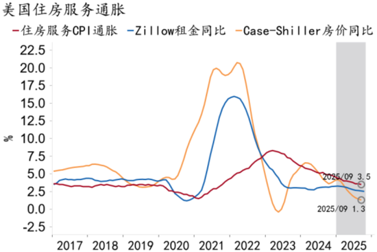 楼市持续处于冰点,美国房价阶段性见顶,住房服务通胀保持趋势性下行。1-9月全美房价同比增速回落2.7pct至1.3%,住房服务通胀回落1.1pct至3.5%(图69)。从楼市供需看,住房供给已从疫情期间低位显著回升,但购房需求仍然受到高房价与高利率的双重压制,房价于2025年阶段性见顶,房租通胀随之稳步下行。