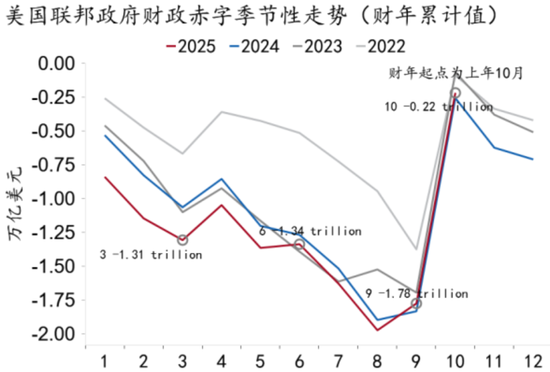 但从节奏看,财政政策经历了从紧缩到扩张的预期转变,成为宏观经济见底回升的关键驱动。随着6月《大而美法案》出台,推出了10年$4万亿的减税法案,“紧财政”叙事终结。该法案导致马斯克与特朗普关系破裂,“政府效率部”成为历史。三季度美国赤字陡增至$4,400亿,较二季度大增$4,100亿,与2024年同期大选冲刺期力度相仿。如若考虑关税约$1,000亿增收效果,三季度真实财政力度还要更大一些。