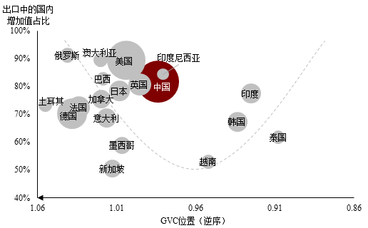 图4 国内增加值占比与全球价值链位置的“微笑曲线”(2024年)[5]