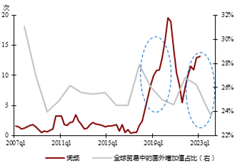 [10] 回岸生产、近岸外包、友岸外包词频的数据来自Alfaro和Chor(2023)。国外增加值占比为年度数据,2007—2022年数据来自ADB MRIO数据库的公开指标,2023—2024年数据由作者基于该数据库的投入产出表测算。