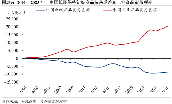 中国在商品贸易上长期呈现“初级产品逆差、工业制成品顺差”的格局。2025年,中国初级产品逆差达8593亿美元;工业制成品顺差达20483亿美元。