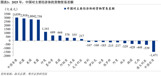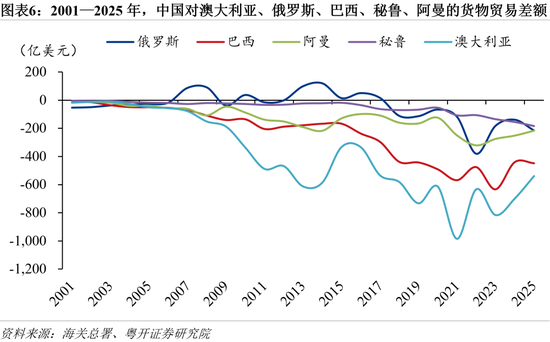 中国的货物贸易逆差也主要来自两类经济体:第一类是资源型经济体,如澳大利亚、巴西、俄罗斯、秘鲁、阿曼、伊拉克等,中国对其能源和矿产资源具有长期且刚性的净进口需求。第二类是技术密集型经济体,如日本、韩国和中国台湾等,中国在部分高端制造和关键环节仍需进口其中间品。