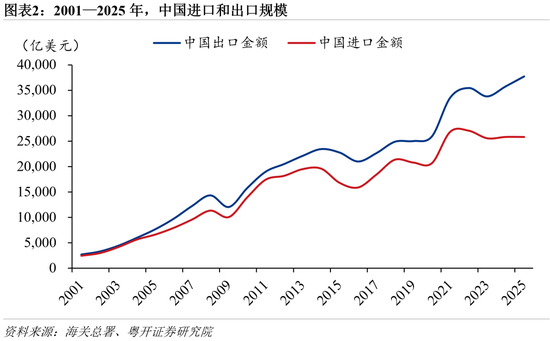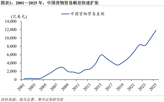 过去二十余年,中国货物贸易顺差整体呈现持续扩张态势。2001年加入WTO后,中国深度嵌入全球分工体系,逐步确立“世界工厂”地位,出口规模在较长时期内保持快速增长,成为推动货物贸易顺差扩大的核心动力。海关总署数据显示,2001—2025年,中国货物贸易顺差年均复合增长18%。2025年中国货物贸易顺差高达11889亿美元,历史上首次破万亿美元,较2024年上升19.8%。货物和服务净出口对GDP增长的拉动达1.64个百分点,为2007年以来次高,仅次于海外需求激增但全球供应链紧张的2021年。
