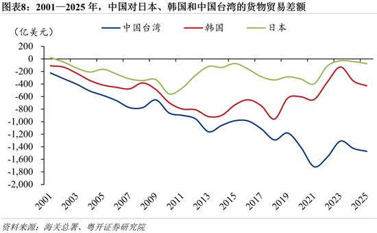 随着中国产业竞争力持续提升,中国对日本和韩国的货物贸易逆差总体呈收窄趋势。2017—2021年中国对韩国和日本的年均货物贸易逆差分别为716亿美元和324亿美元;2022—2025年则分别收窄至320亿美元和66亿美元。中国在部分中高端制造领域加快推进国产替代进程,对日本、韩国关键零部件和专用设备的进口依赖度持续下降。