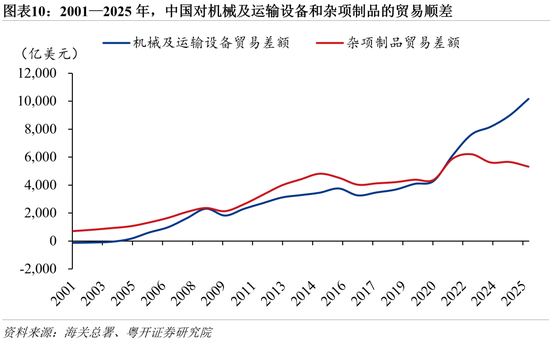 工业制成品内部结构发生显著变化,顺差来源由以家具、鞋靴等低附加值杂项制品为主,逐步转向以机械及运输设备等高附加值产品为主。随着顺差重心从低附加值制品向高端制造切换,2025年工业制成品顺差较2024年扩大8.3%。